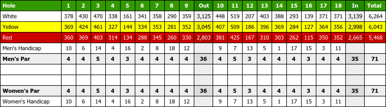 The course rating is 701 and it has a slope rating of 128 on Bent grass. View key info about Course Database including Course description Tee yardages par and handicaps scorecard contact info Course Tours directions and more. We host golf outings and corporate picnics from April through October with groups ranging from 50 to 144 players.